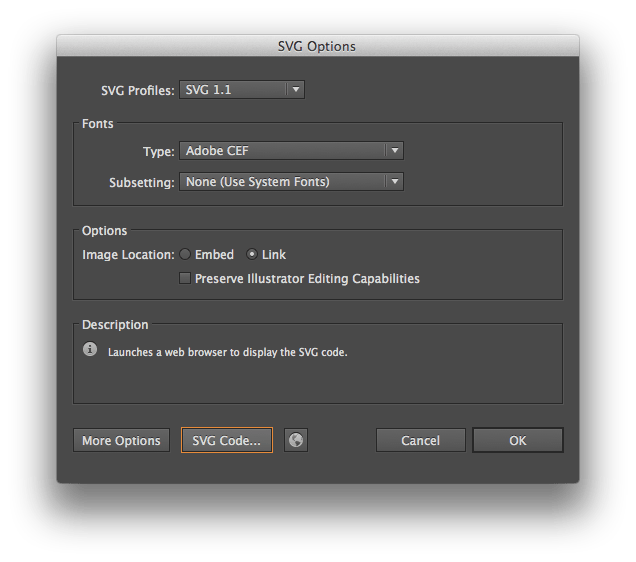 As you save it, you'll get another dialog for SVG Options. I honestly don't know much about all this. There is a whole spec for SVG Profiles. I find SVG 1.1 works fine.